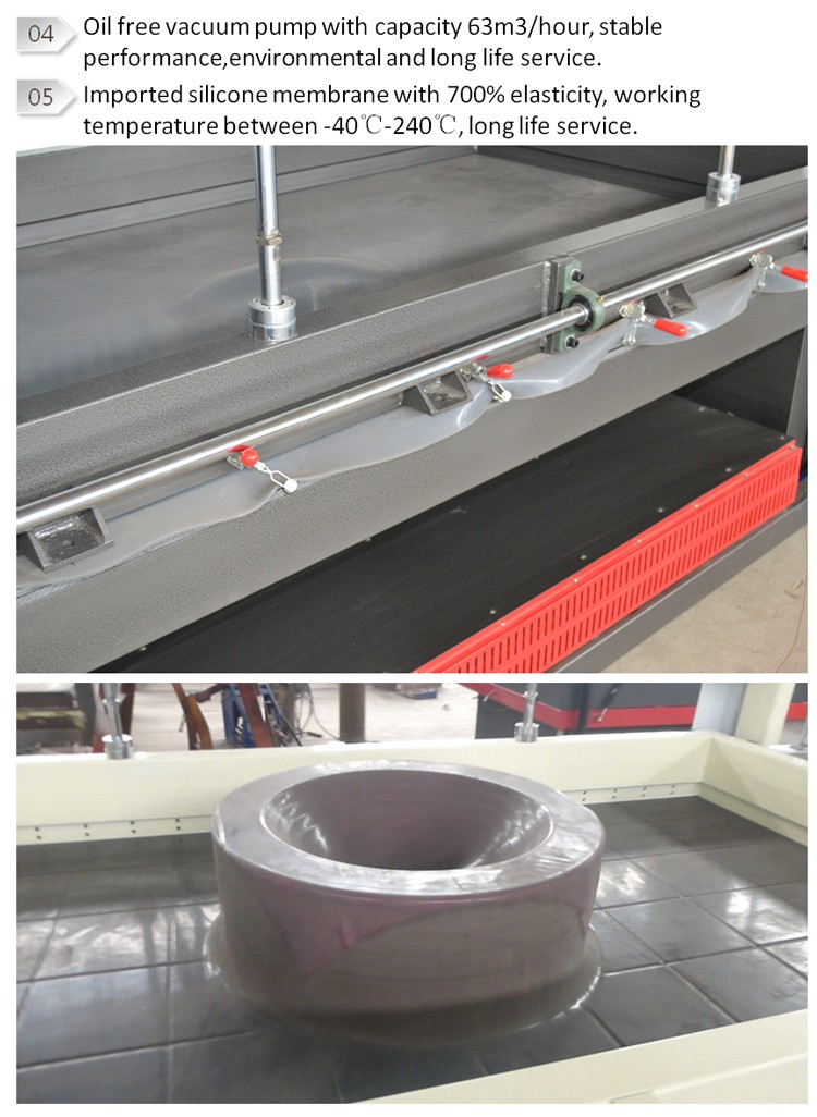 1.采用60m3/h旋片式真空泵,性能穩定,環保,長時間工作穩定。真空力作到工件上是9t/m2;