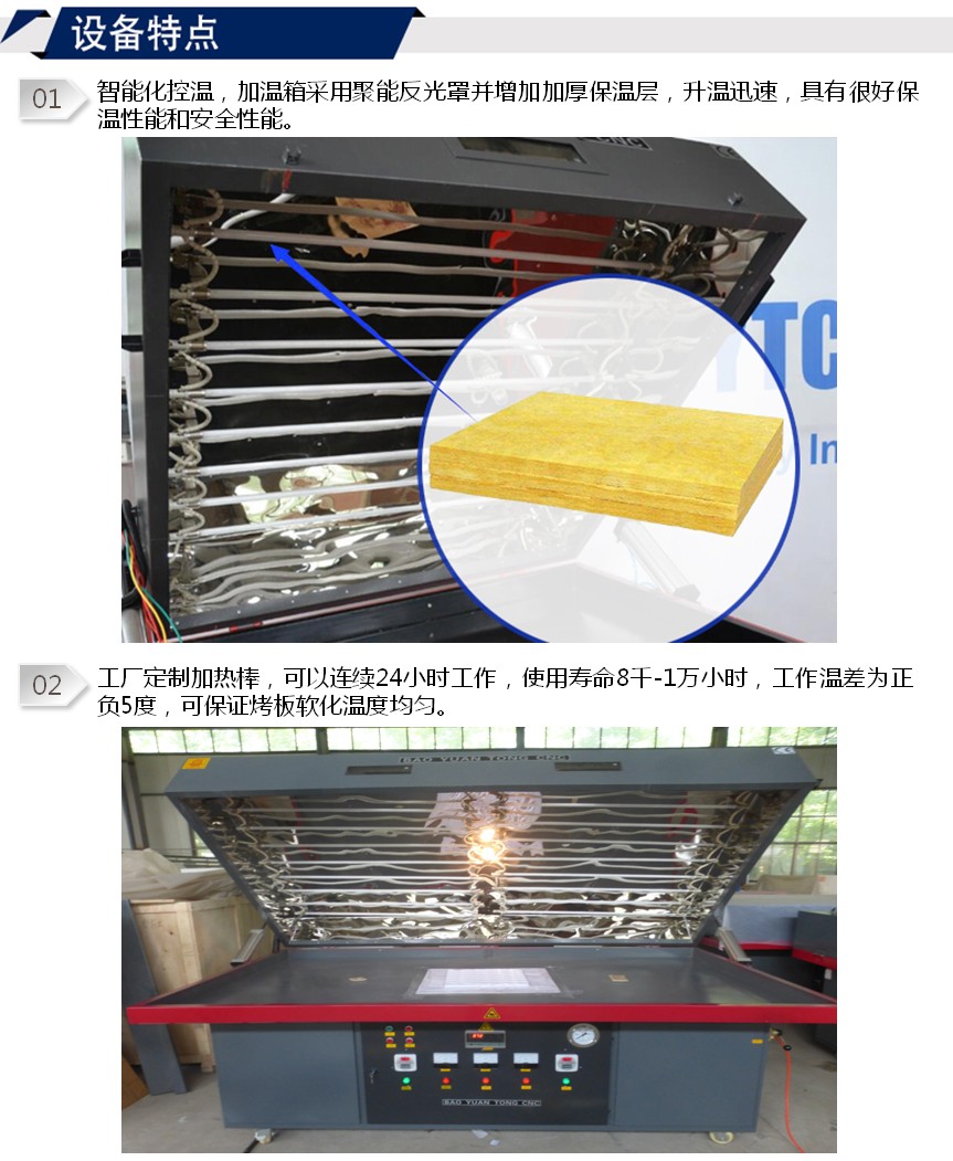 2.工廠定制加熱棒,可以連續24小時工作,使用壽命8千-1萬小時,工作溫差為正負5度,可保證烤板軟化溫度均勻。